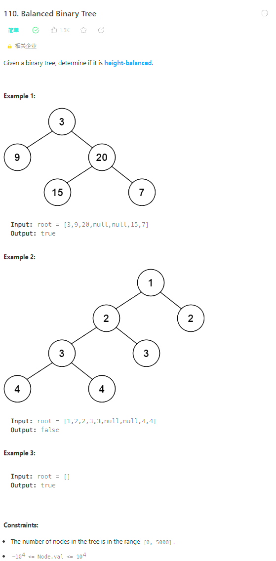 | class Solution { private: int getDepth(TreeNode* cur) { if (!cur) return 0; int depth = 0; queue<TreeNode *> que; que.push(cur); while (!que.empty()) { int qsize = que.size(); depth++; for (int i = 0; i < qsize; i++) { TreeNode *node = que.front(); que.pop(); if (node -> left) que.push(node -> left); if (node -> right) que.push(node -> right); } } return depth; } public: bool isBalanced(TreeNode* root) { if (!root) return true; stack<TreeNode *> st; st.push(root); while (!st.empty()) { TreeNode *node = st.top(); st.pop(); if (abs(getDepth(node -> left) - getDepth(node -> right)) > 1) { return false; } if (node -> right) st.push(node -> right); if (node -> left) st.push(node -> left); } return true; } };