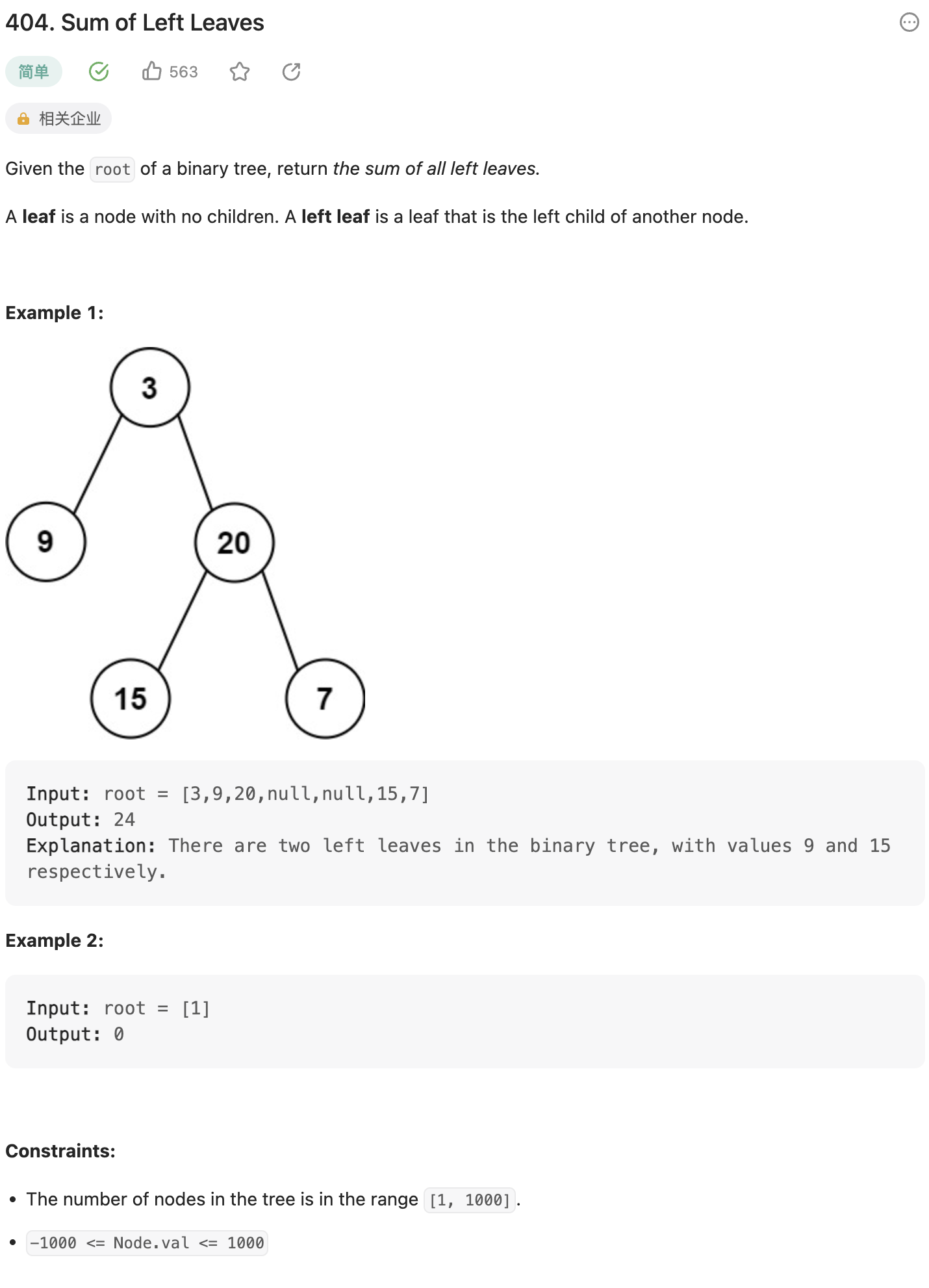 | class Solution { public: int sumOfLeftLeaves(TreeNode* root) { if (!root) return 0; if (!(root -> left) && !(root -> right)) return 0; int leftVal = sumOfLeftLeaves(root -> left); if (root -> left && !(root -> left -> left) && !(root -> left -> right)) { leftVal += root -> left -> val; } int rightVal = sumOfLeftLeaves(root -> right);